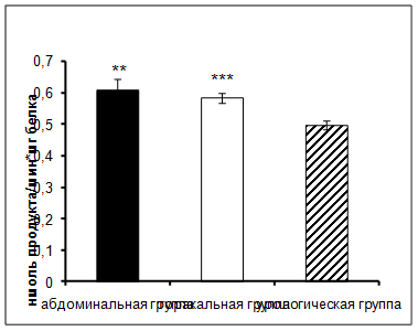 Рис. 1. Активность КПN у онкологических больных в ранний послеоперационный период (нмоль продукта, образовавшегося за 1 мин инкубации на 1 мг белка, M±m, n=12¸18; достоверность отличий: ** – р < 0,01, *** – р < 0,001 относительно урологической группы).
