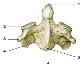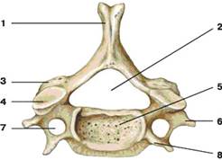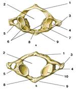 У I шейного позвонка, или атланта (рис. 3), тело отсутствует; его латеральные массы соединены двумя дугами - передней и задней. Верхняя и нижняя плоскости латеральных масс имеют суставные поверхности (верхнюю и нижнюю), посредством которых I шейный позвонок соединяется соответственно с черепом и II шейным позвонком.