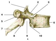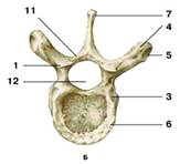 В строении отдельного позвонка выделяют тело позвонка и дугу позвонка, которая замыкает позвоночное отверстие. На дуге позвонка расположены отростки различной формы и назначения: парные верхние и нижние суставные отростки, парные поперечные и один остистый отросток, выступающий от дуги позвонка назад. Основание дуги имеет так называемые позвоночные вырезки - верхнюю и нижнюю. Межпозвонковые отверстия, образованные вырезками двух соседних позвонков, открывают доступ к позвоночному каналу слева и справа (рис. 1, 3, 5, 6, 7).