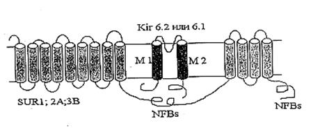 Также был клоирован регуляторный белок, содержащий участок, связывающий сульфонилочевину (SU-связывающий сайт) [Aguillar-Bryan et al., 1995; Thomas et al., 1995; Inagaki et al., 1996; Isomoto et al., 1996]. Клонированные регуляторные белки получили название SUR. SUR содержит два нуклеотидсвязывающих участка (NFBs) с цитоплазматической стороны. N-конец находится с внешней стороны мембраны и содержит два домена, предположительно из 9 и 4 пронизывающих мембрану спиралей (Рис.2) [Yokoshiki et al., 1998].