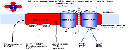 Так как митоКАТФ имеет ряд общих свойств с цитоКАТФ и регулируется общими регуляторами, было предположено, что по структуре он близок к цитоплазматическому каналу [Mironova et al., 1999] и состоит из канальной субъединицы [Mironova et al., 2004] и регуляторной [Bajgar et al., 2001]. Белок с м. м. 55 кДа, выделенный из внутренней мембраны МХ печени крысы, является, по-видимому, канальной субъединицей митоКАТФ. При встраивании в БЛМ этот белок формирует АТФ-зависимые каналы (митоKIR). Активность этих каналов не блокируется глибенкламидом и специфическим ингибитором митоКАТФ 5-ГД, и не активируется кромакалимом и ддиазоксидом. Однако эти препараты влияют на АТФ-зависимый калиевый транспорт в изолированных МХ, где есть обе субъединицы канала [Mironova et al., 2004].