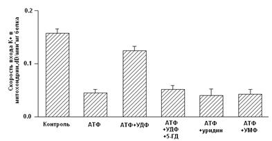 В МХ УДФ (~20 мкМ) активирует митоКАТФ, и эта активация снимается глибенкламидом и 5-ГД (Рис. 4) [Mironova et al., 2004]. Концентрации УДФ, неоходимые для активации реконструированного в БЛМ митоKIR и целого канала в нативных МХ, одинаковы. Следовательно, участок связывания УДФ локализуется на канальной субъединице. Для активации цитоКАТФ нужны значительно большие концентрации этого препарата [Alekseev et al., 1998].