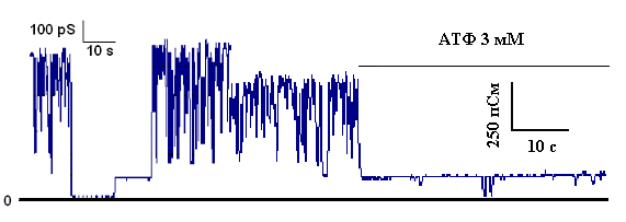 Полученным электрофоретически гомогенным белком с м.м. 55 кДа модифицировали искусственные бислойные мембраны. Было показано, что данный белок обладает селективной К+-транспортирующей активностью и ингибируется физиологическими концентрациями АТФ (Рис.18).