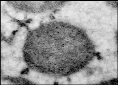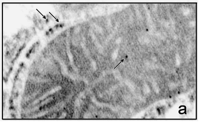 Рис.21а. Электронная микроскопия среза гепатоцита крысы. а - Срезы инкубированы с антителами к митохондриальному К+-транспортирующему белку. Черные гранулы (указаны стрелкой) -сайты локализации К+-транспортирующего белка с м.м. ~ 55 кДа в митохондриях.