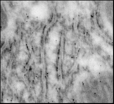 Рис.22. Электронная микроскопия эндоплазматический ретикулум (ЭР) на срезе гепатоцитов крысы. Срезы инкубированы с антителами к митохондриальному К+-транспортирующему белку.
