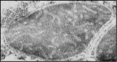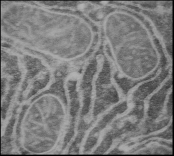 Рис.21 б. Митохондрии и саркоплазматический ретикулум (СР) на срезе кардиомицитов крысы. Срезы инкубированы с антителами к митохондриальному К+-транспортирующему белку. Черные гранулы- сайты локализации К+-транспортирующего белка с м.м. ~ 57 кДа в митохондриях, а также сайты связывания антител с СР.
