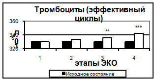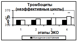 Рис. 1. Количество тромбоцитов в эффективных и неэффективных циклах. Здесь и на рис. 2-6 1- стимуляция суперовуляции, 2- день введения хорионического гонадотропина, 3- день переноса эмбриона в полость матки, 4- 14–ый день после переноса эмбриона. Достоверность отличий: