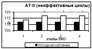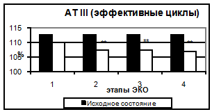 АТ III практически не изменялся на всем протяжении исследования. Отмечалось лишь достоверное снижение активности АТ III (на 5,1%) ко дню введения овуляторной дозы ХГ (пик стимуляции и уровня эстрадиола).