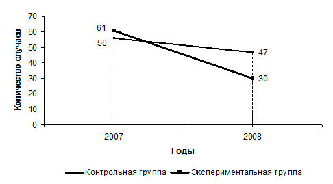 По завершении эксперимента мы проанализировали заболеваемость детей контрольной и экспериментальной групп за 2008 год. Данные представлены в таблице 2.