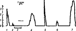 1 — ацетилхолина — 10-4; 2 — ацетилхолина — 5∙10-5; 3 — свежей плазмы; 4 — плазмы, постоявшей 4 мин. в стеклянной пробирке; 5 — ацетилхолина — 10-3; 6— серотонина — 10-6; 7 — брадикинина — 10-6