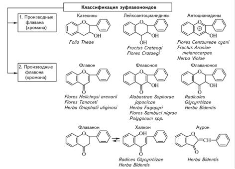 Классификация флавоноидов основана на ряде признаков, таких как степень окисленности пропанового фрагмента, положение бокового фенильного радикала, величина гетероцикла и др. По расположению кольца В выделяют собственно флавоноиды (эуфлавоноиды), изо- и неофлавоноиды.