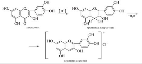 Цианидиновую реакцию не дают халконы, ауроны, катехины, но они могут образовывать в кислой среде окрашенные оксониевые соли.