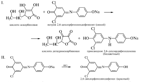 Метод определения количественного содержания кислоты аскорбиновой в плодах шиповника основан на ее способности окисляться до дегидроформы раствором натрия 2,6-дихлорфенолиндофенолята и восстанавливать последний до лейкоформы (I). Точка эквивалентности устанавливается появлением розового окрашивания, которое свидетельствует об отсутствии восстановителя, т.е. кислоты аскорбиновой (2,6-дихлорфенолиндофенол имеет в щелочной среде синее окрашивание, в кислой - красное, а при восстановлении обесцвечивается) (II).