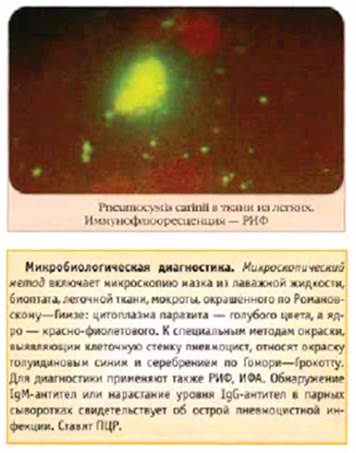Диагноз пневмоцистоза может быть поставлен лишь при бесспорной идентификации P. carinii в патологическом материале. Пневмоцистоз протекает в виде моноинфекции или смешанной инфекции, например с криптококкозом, цитомегаловирусной инфекцией, туберкулезом.