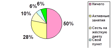 В следующем вопросе предлагалось выбрать что они готовы сделать для идеальной фигуры. На первом месте (50%) пункт “ничего”, на втором месте (28%) “активные занятия спортом”, на третьем месте (10%) “сесть на жесткую диету”. 6% отметили свой пункт “другое” и 6% респондентов не ответили.