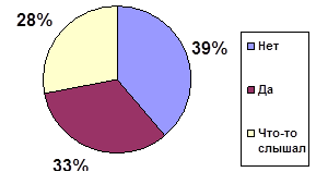 Знакомо ли понятие “булимия” данной возрастной категории мы определили с помощью следующего вопроса. Ответы распределились следующим образом: 39% не знают данное понятие, 33% понятие “булимия знакомо” и 28% что-то слышали об этом.
