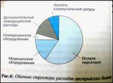 Наконец стоит остановиться и на структуре финансовых расходов больничного сектора. Примечательно, что самую большую часть занимает не сама врачебная деятельность, но общие расходы за оплату персонала. (рис 4). Этому соответствуют цели различных реформ, проводимых в здравоохранении. Они вызваны с одной стороны увеличением расходов на лечение пациентов вследствие технического прогресса, с другой стороны, стагнаций налоговых и других поступлений в здравоохранение из-за общего обострения экономической ситуации (прямая или косвенная безработица), а также и прогрессирующим старением населения. Пенсии и пособия для безработных загружают бюджет для социального обеспечения требуют снижения числа дорогих «клинических» коек, переведя их в койки «гериатрические» или отменяя их вообще. В этом смысле желательно и снижение срока пребывания в стационаре («готелерии») до минимума путем использования соответственной медицинской техники (напр. Эндоскопичеческие операционные технологии). Также, очень часто предлагается выделение из структур здравоохранения или приватизации как вспомогательных, немедицинских служб (прачечные и т.п.) так и некоторых медицинских подразделений (диагностико-радиологические и лабораторные).