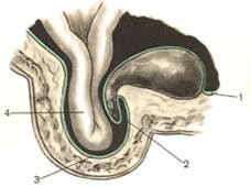 1 — peritoneum; 2 — мочевой пузырь; 3 — грыжевой мешок; 4 — тонкая кишка