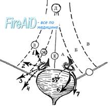 А - надпузырная ямка брюшины; Б - медиальная ямка брюшины; В - латеалъная ямка брюшины; Г - паховая связка; Д - пупок; Е - срединная пупочная складка; Ж - медиальная пупочная складка; 3 - латеральная пупочная складка. Виды наружных надпузырных грыж: 1 - внутристеночная; 2 - прямая паховая; 3 - бедренная; 4 - запирательная. Виды внутренних надпузырных грыж: 5 - задняя (ретровезикальная); 6 - передняя (превезикальная); 7 - латеральная (паравезикальная)