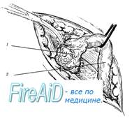 1 - рассеченные оболочки семенного канатика; 2 - грыжевой мешок