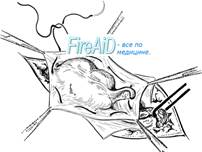 Обработка грыжевого мешка при скользящей грыже. Кисетный шов, наложенный при скользящей грыже, может быть сквозными проколами фиксирован к внутренней косой мышце. Таким образом, культя смещается по отношению к внутреннему паховому кольцу: