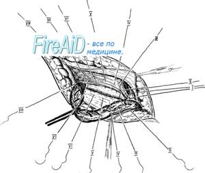 I-II -узловые швы между влагалищем прямой мышцы и паховой связкой (первый шов захватывает надкостницу лонного бугорка),