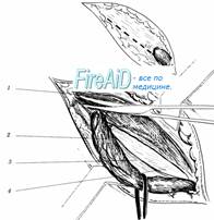 1 - внутренняя косая и поперечные мышцы живота; 2 - семенной канатик; 3 - паховая связка; 4 - поперечная фасция
