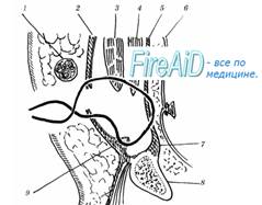 1 - семенной канатик; 2 - апоневроз наружной косой мышцы живота; 3 - внутренняя косая мышца; 4 - поперечная мышца живота; 5 - поперечная фасция; 6 - брюшина; 7 - куперова связка; 8 - лонная кость; 9 - паховая связка