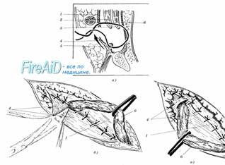 Внутренняя косая и поперечные мышцы не рассекаются. В латеральном (нижнем) листке апоневроза наружной косой мышцы делается поперечный разрез. Верхний лоскут апоневроза вместе с внутренней косой и поперечными мышцами подшивается к паховой связке с захватом в шов поперечно! фасции (б).