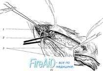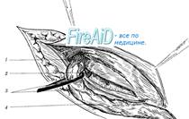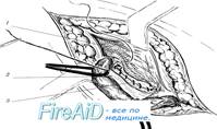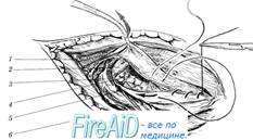 1 - пересеченная мышца, поднимающая яичко; 2 - пересеченные наружные семенные сосуды; 3 - рассеченная поперечная фасция; 4 - семенной канатик