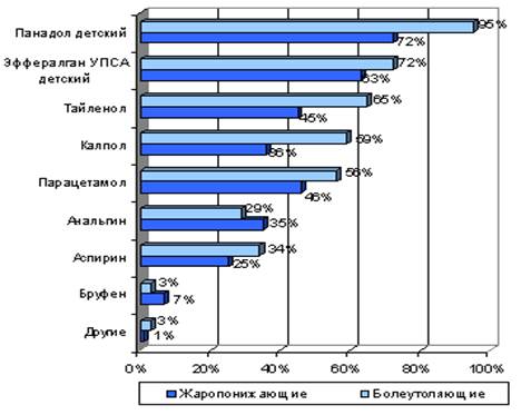 Многие существующие на рынке препараты обладают как жаропонижающим, так и болеутоляющим действием. Однако часто они позиционируются производителем или воспринимаются потребителями только как жаропонижающее или только как болеутоляющее средство. Для получения наиболее полной информации, вопросы о жаропонижающих и болеутоляющих препаратах задавались отдельно (диагр. 5).