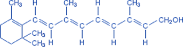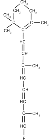 ионона (формула I). Кристаллические вещества, не растворимы в воде, хорошо растворяются в органических растворителях. Разлагаются при взаимодействии с О2. Склонны к цис-транс-изомеризации, особенно по связям 11 и 13. Важнейшие представители: ретинол (витамин А1, витамин А1-спирт, эксерофтол; формула II, R = = СН2ОН), ретиналь (ретинен, ретинальдегид, витамин A1-альдегид; II, R = СНО) и ретиноевая кислота (витамин А2, II, R == СООН). У всех соединений, кроме 11-цис-ретиналя, присутствующего в сетчатке глаз, все двойные связи имеют транс-конфигурацию. [11]