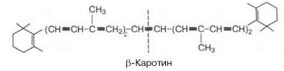 Каротин, впервые был выделен из моркови (от лат. carota – морковь). Известны 3 типа каротинов: α-, β- и γ-каротины, отличающиеся друг от друга химическим строением и биологической активностью. Наибольшей биологической активностью обладает β-каротин, поскольку он содержит два β-иононовых кольца и при распаде в организме из него образуются две молекулы витамина А.