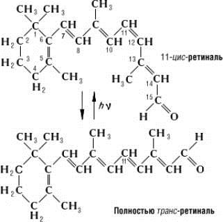 Более подробно выяснено значение витамина А в процессе свето-ощущения. В этом важном физиологическом процессе большую роль играет особый хромолипопротеин – сложный белок родопсин, или зрительный пурпур, являющийся основным светочувствительным пигментом сетчатки, в частности палочек, занимающих ее периферическую часть. Установлено, что родопсин состоит из липопротеина опсина и простети-ческой группы, представленной альдегидом витамина A1(ретиналь); связь между ними осуществляется через альдегидную группу витамина и свободную ε-NH2-группу лизина молекулы белка с образованием шиффова основания. На свету родопсин расщепляется на белок опсин и ретиналь; последний подвергается серии конформационных изменений и превращению в транс-форму. С этими превращениями каким-то образом связана трансформация энергии световых лучей в зрительное возбуждение – процесс, молекулярный механизм которого до сих пор остается загадкой. В темноте происходит обратный процесс – синтез родопсина, требующий наличия активной формы альдегида – 11-цис-ретиналя, который может синтезироваться из цис-ретинола, или транс-ретиналя, или транс-формы витамина А при участии двух специфических ферментов – дегидрогеназы и изомеразы. Более подробно цикл превращений родопсина в сетчатке глаза на свету и в темноте можно представить в виде схемы: